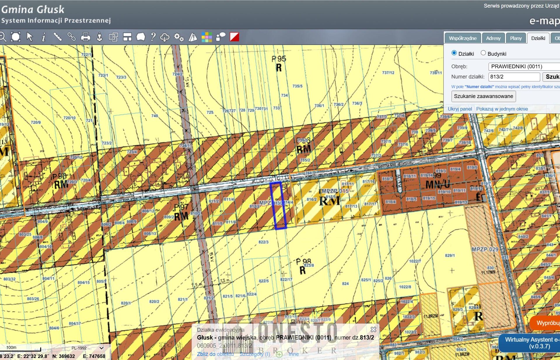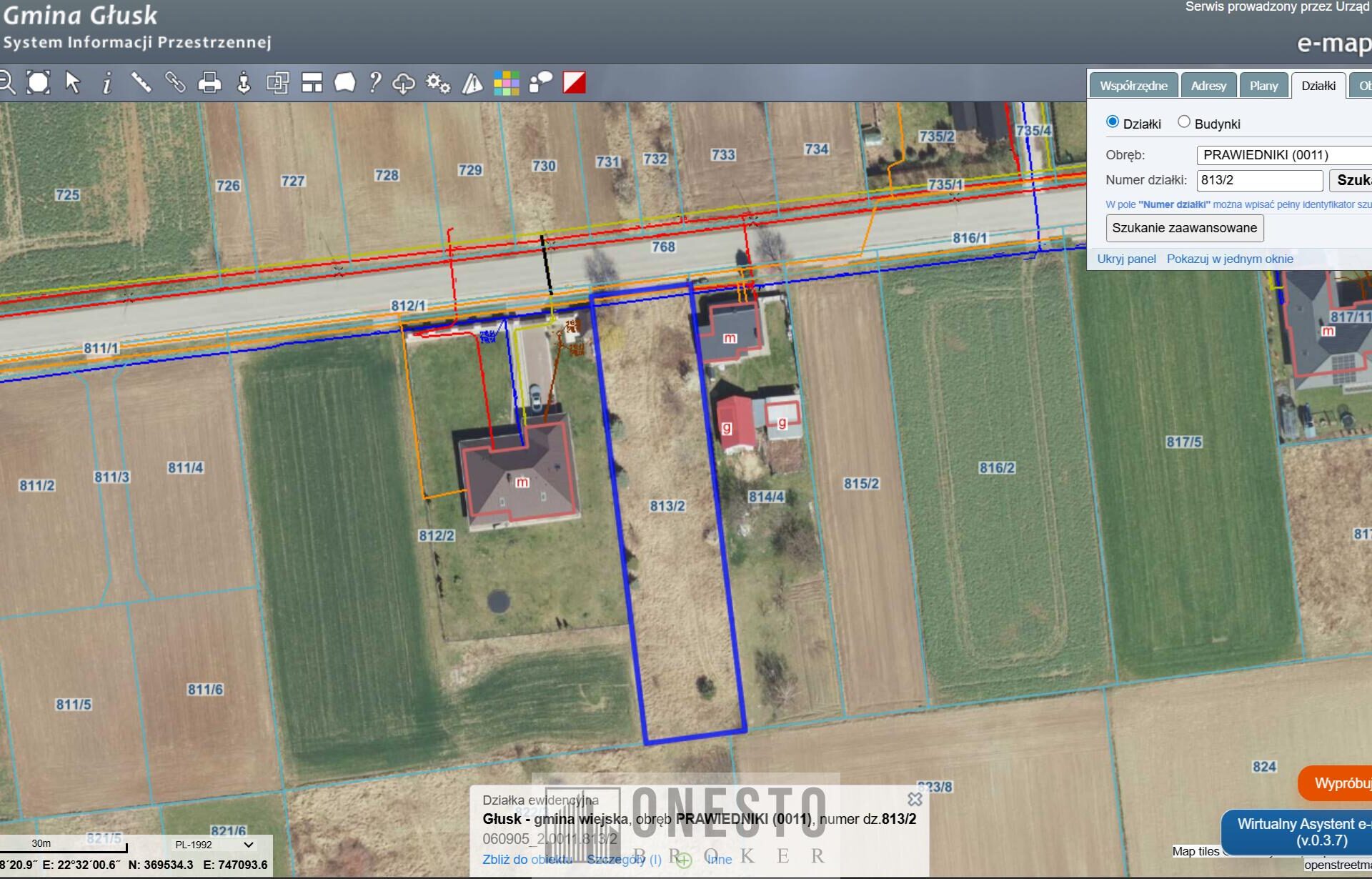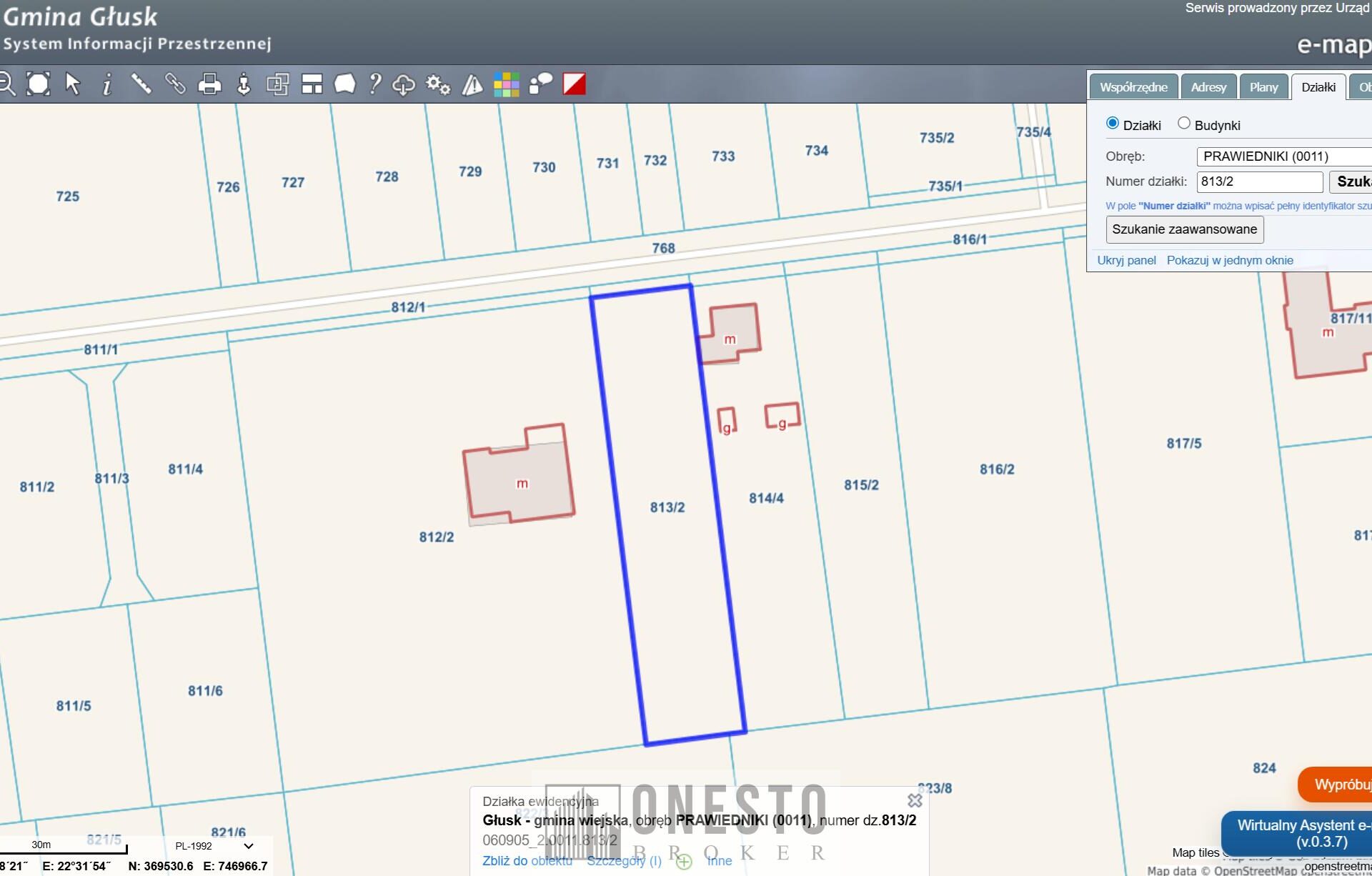 Działka nr ewid. 813/2, kształt regularny, teren płaski, nieogrodzony. Pierwsza linia zabudowy. Wjazd bezpośrednio z drogi asfaltowej (status drogi KDD – droga dojazdowa tzw. lokalna, publiczna – zarządzana przez gminę).