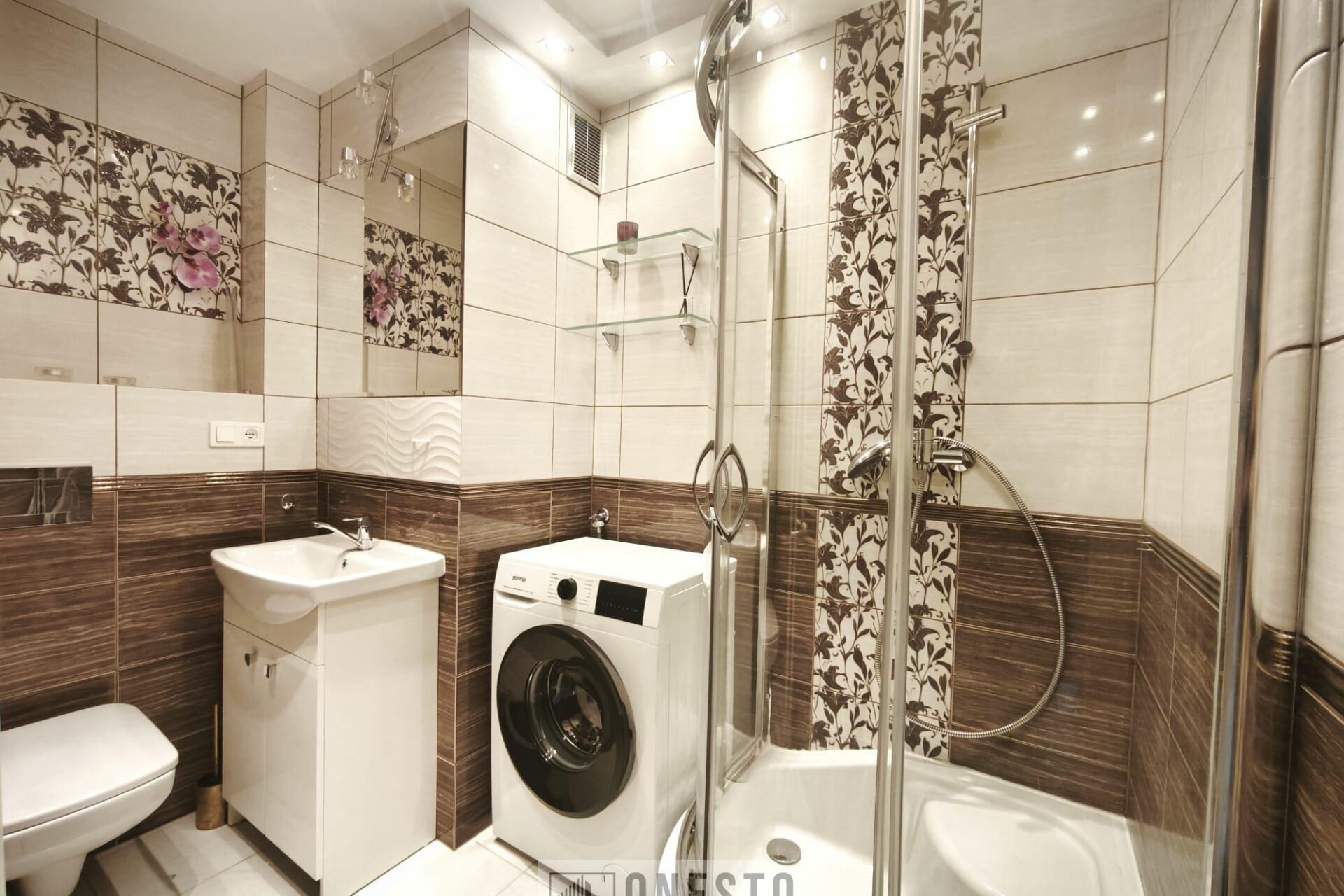 - łazienka z WC (wyposażenie: umywalka, prysznic, pralka)
