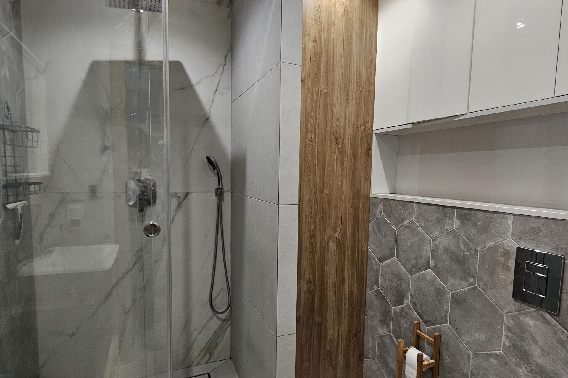W łazience połączonej jest z WC znajdziemy prysznic, a także estetyczną zabudowę wraz z pralką.